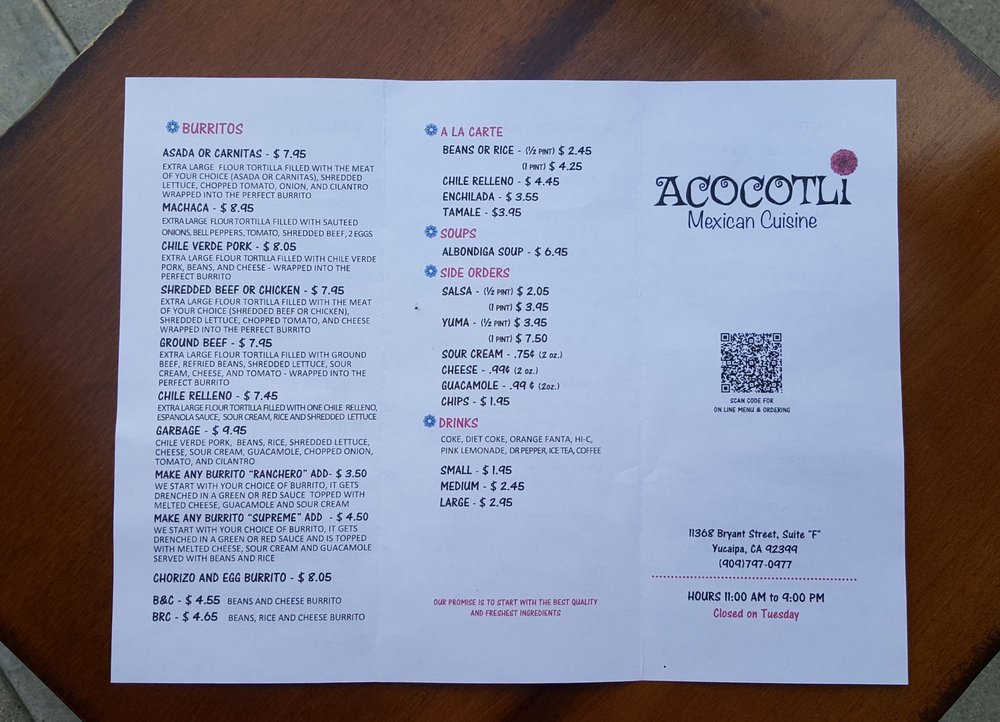 Acocotli Mexican Cuisine, located in Yucaipa, CA, is a hidden gem that offers authentic Mexican flavors with a twist. Known for its excellent food quality and fair prices, this small family-owned restaurant has garnered rave reviews from customers. With options for vegans and limited vegetarian choices, Acocotli caters to a diverse clientele. The menu features must-try dishes like chile verde, served generously with tender pork, flavorful tortillas, and spicy salsa. The friendly staff adds a personal touch, making dining here a delightful experience. Customers praise the quick service, fresh food, and the option to enjoy outdoor seating. Whether you're craving Mexican comfort food or looking for a casual dining spot, Acocotli Mexican Cuisine is a top recommendation for its delicious offerings and inviting atmosphere.